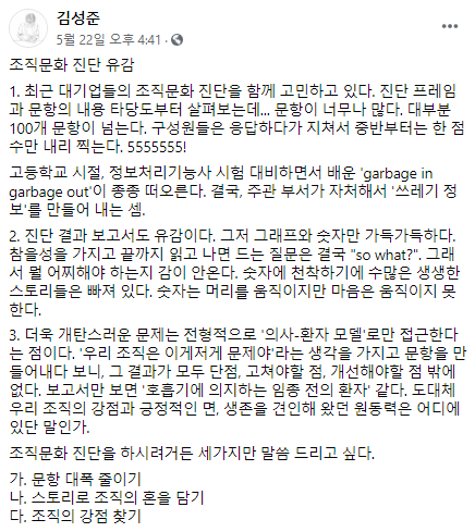 조직문화 진단이 끝나고 결과보고서를 작성하던 중 성준 님의 페북에서 <조직문화 진단 유감>이라는 짧은 글을 봤다. 이 글을 보고 머리를 한 대 맞은 것 같았다. 성준 님은 대부분의 조직문화 진단이 조직의 문제점만 드러낸다는 점을 지적했다. 어찌 됐든 조직이 지금까지 살아남은 강점이 있는데 그 부분은 드러내지 않고, 문제만 잔뜩 드러내니 진단 보고서를 보면 산소 호흡기를 붙이고 있는 환자처럼 느껴진다는 뜻이었다.